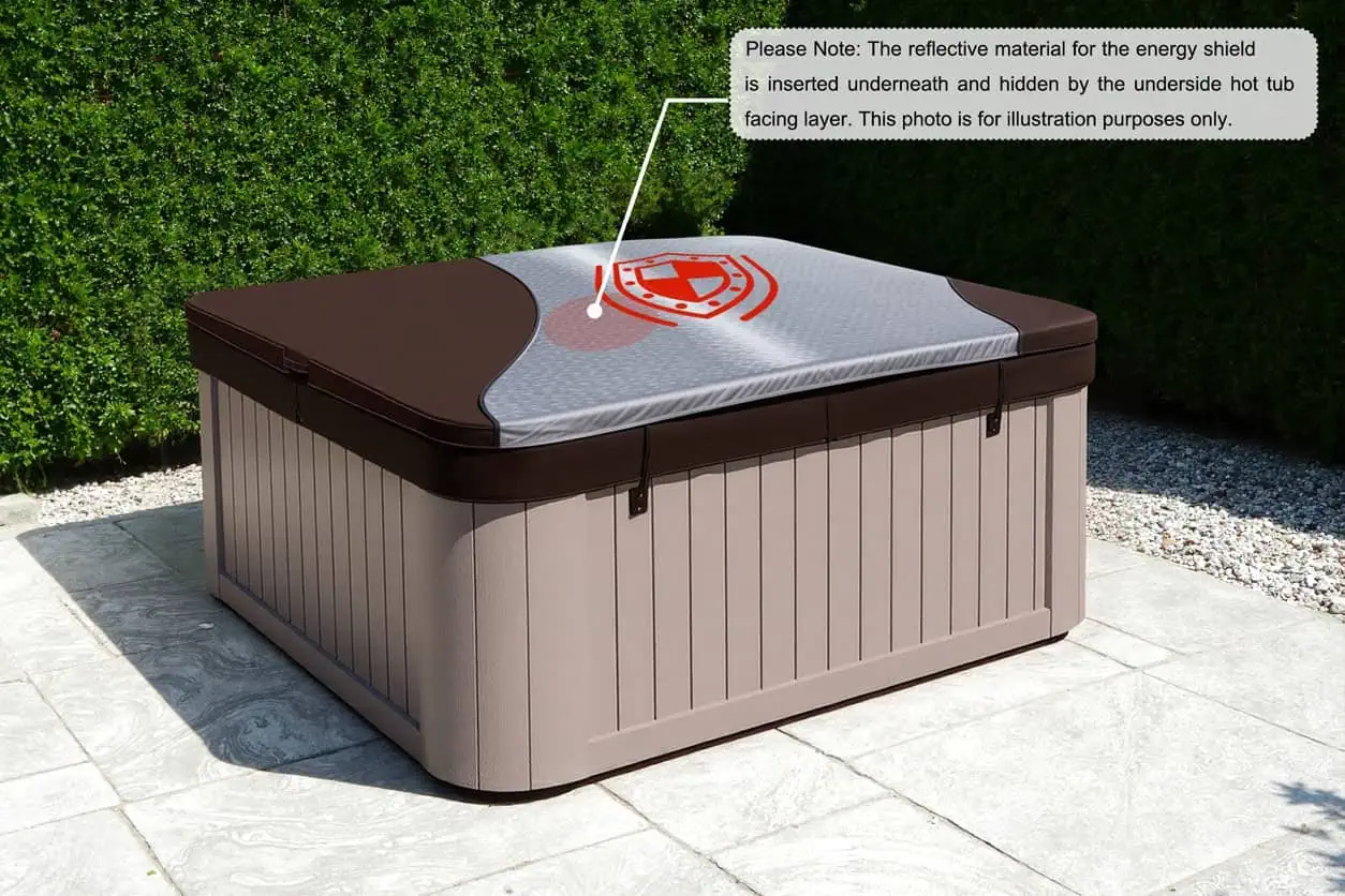 The energy shield is an additional layer of insulation that helps keep the heat inside the hot tub, reducing the load on your heating system. The energy shield upgrade offers an extra layer in efficiency. It is a heat reflective material on the underside of the cover that reflects heat back into your spa (available as an upgrade).